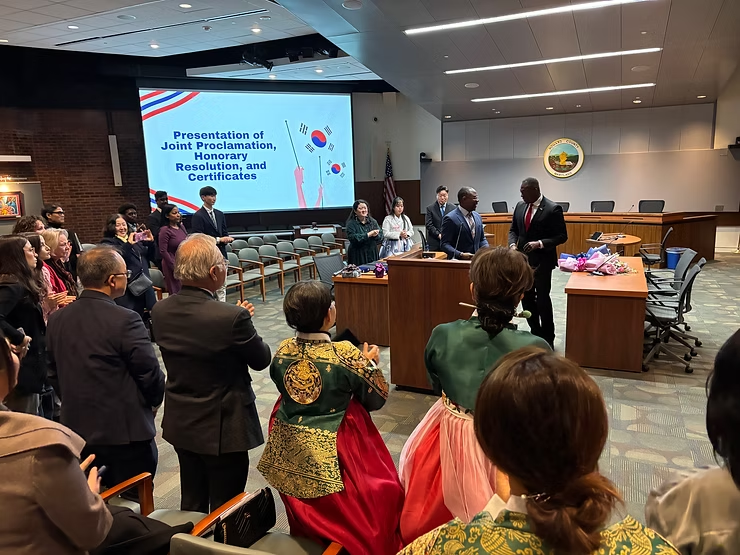이어 그는 하워드 카운티의회 오펠 존스 의장과 함께 카운티를 대표해 ‘미주 한인의 날’을 공식 선언하는 ‘선언문’과 ‘명예 결의안’을 낭독하고 전달한 뒤, 1월 13일을 하워드 카운티 ‘미주 한인의 날’로 공식 선포했습니다.