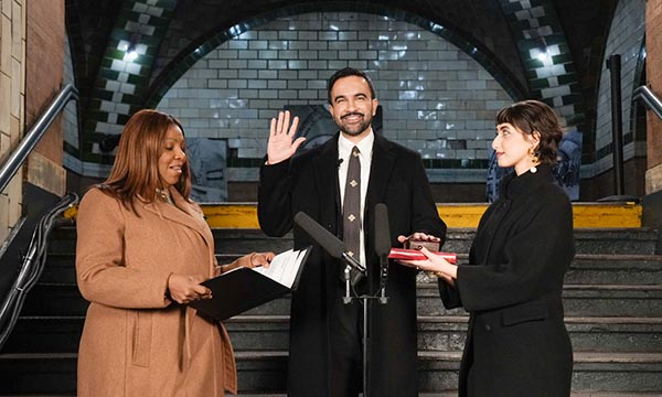 <앵커> 세계 자본주의의 심장인 뉴욕에서 뉴욕시 역사상 처음으로 무슬림 시장이 탄생했습니다. 조란 맘다니 시장은 새해 첫날, 성경 대신...